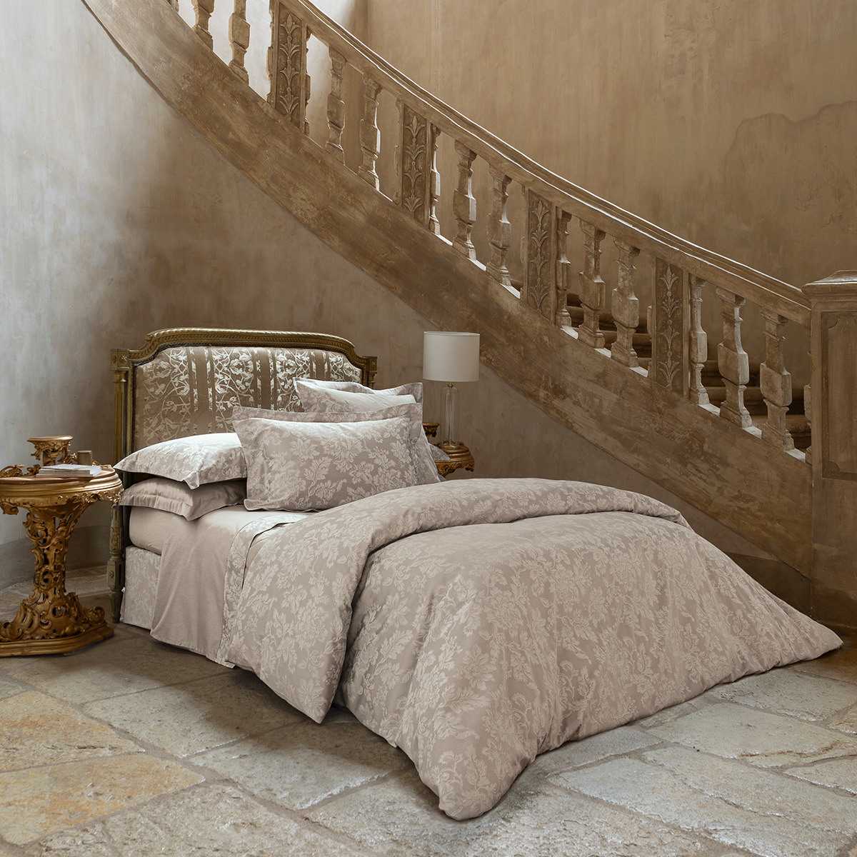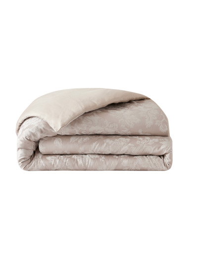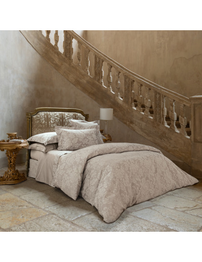 Ce damassé floral aux courbes douces insuffle une lumière sophistiquée de tonalité seigle et blanc cassé, pour une chambre élégante et soyeuse. Le verso de la housse est dans un satin grège uni.