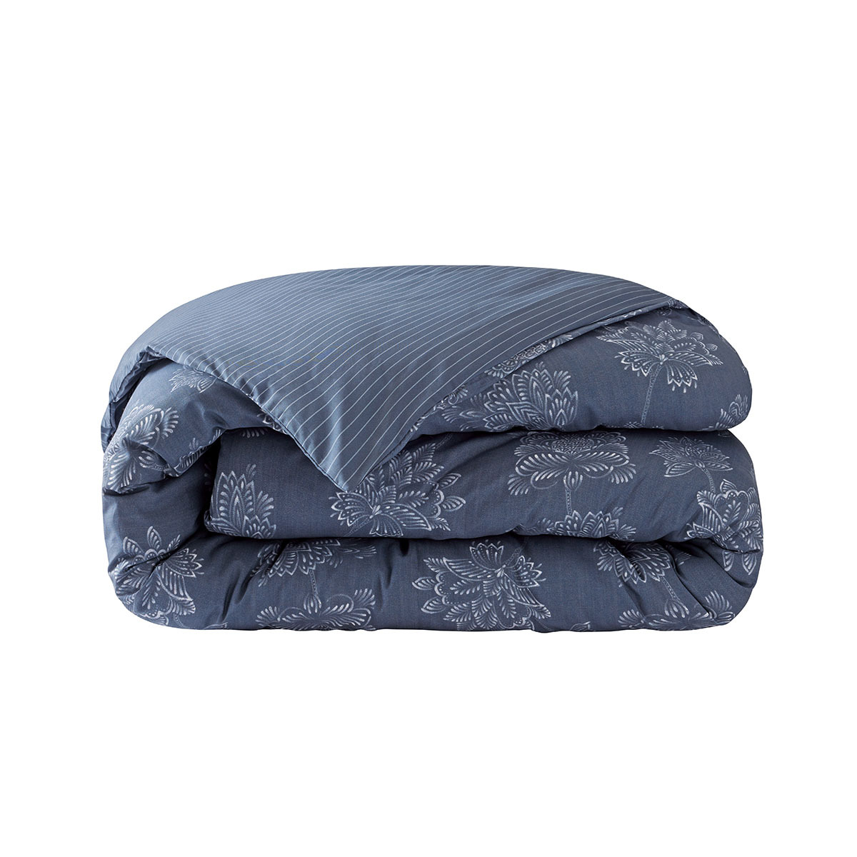 Imprimée sur une percale 80 fils/cm² cette housse de couette marie le féminin masculin avec cette association de fleurs de Perse et de rayures fines qui semblent empruntées à une veste de costume.
