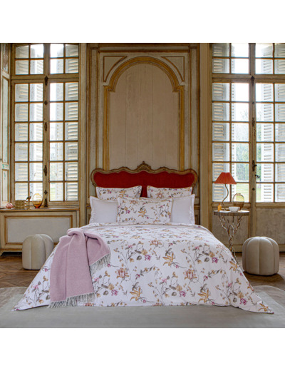 Le modèle Perle Lune est composé de cette housse de couette, des taies d’oreillers, de la taie de traversin, du drap plat et du drap housse. Une gamme de serviettes éponge et un peignoir féminin complètent cette parure.