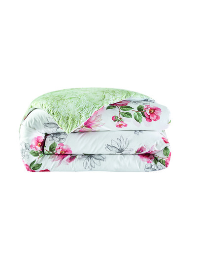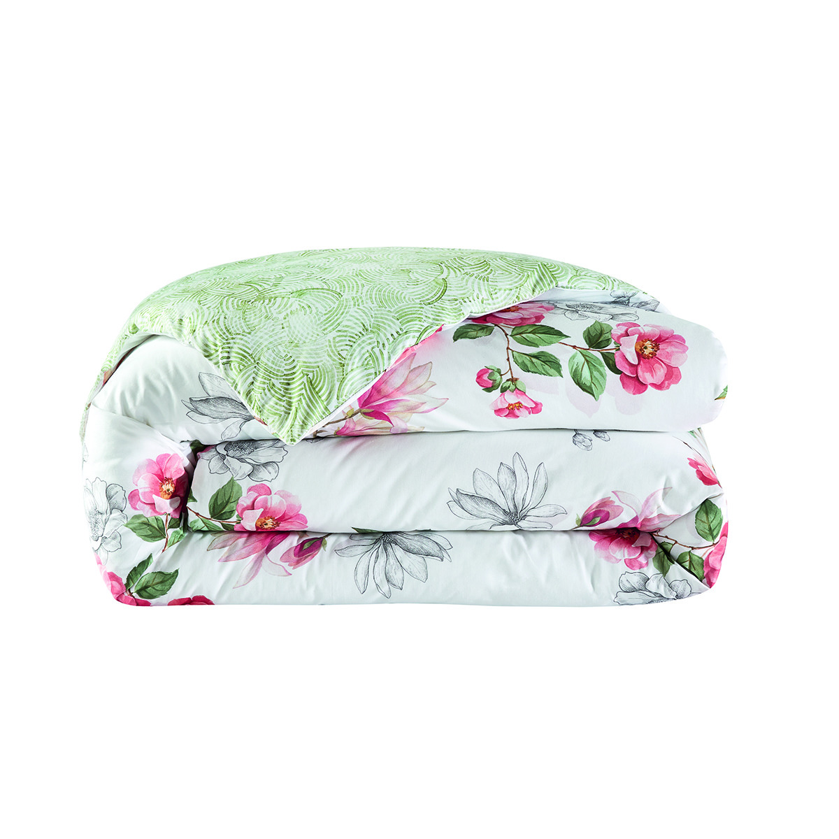 La housse de couette se couvre de fleurs multicolores sur fond blanc optique et un verso au discret motif géométrique vert, très graphique.