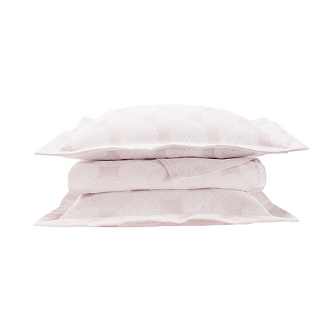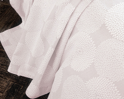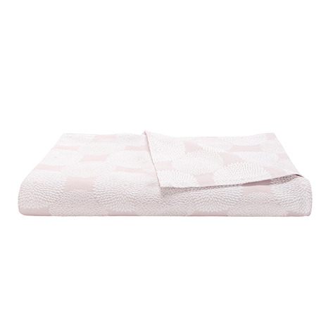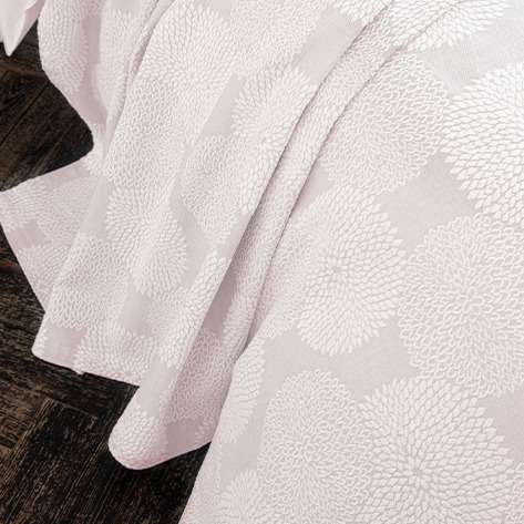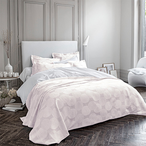 Le couvre-lit Dahlia rose en jacquard 380 gr/m² s’orne de subtiles fleurs piquées de couleur blanche sur un fond rose pâle. Il se compose de 80% de coton et de 20% de polyester.