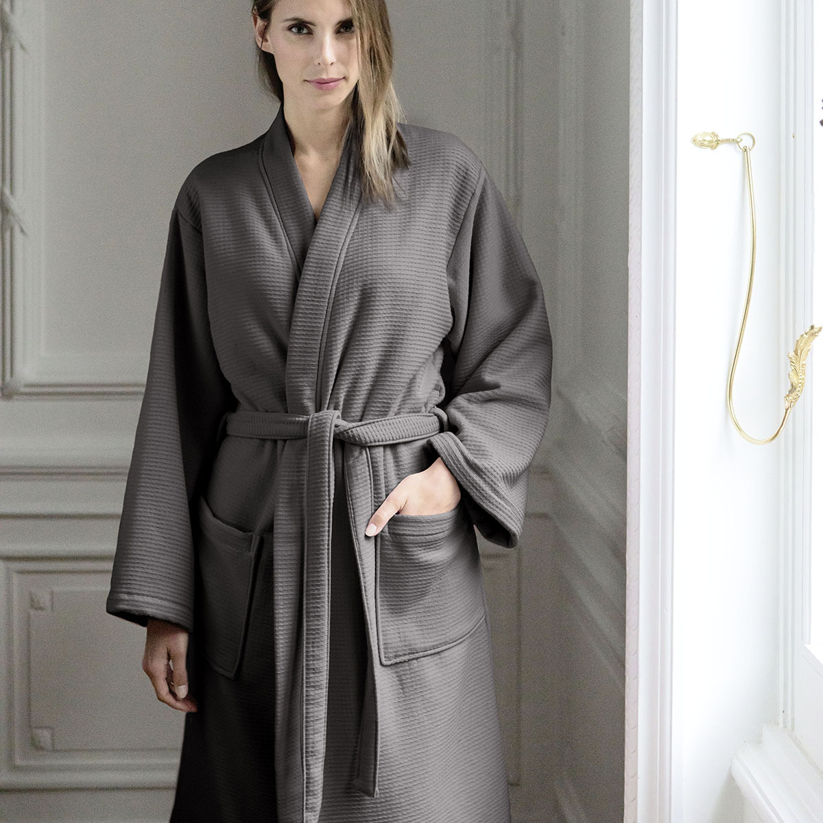 Craquez pour l’élégance de ce peignoir de bain en forme kimono, à la fois moderne et intemporel. En structure alvéolaire nid d'abeille , il bénéficie d'un intérieur bouclette 100 % coton peigné avec un grammage de 420g/m².