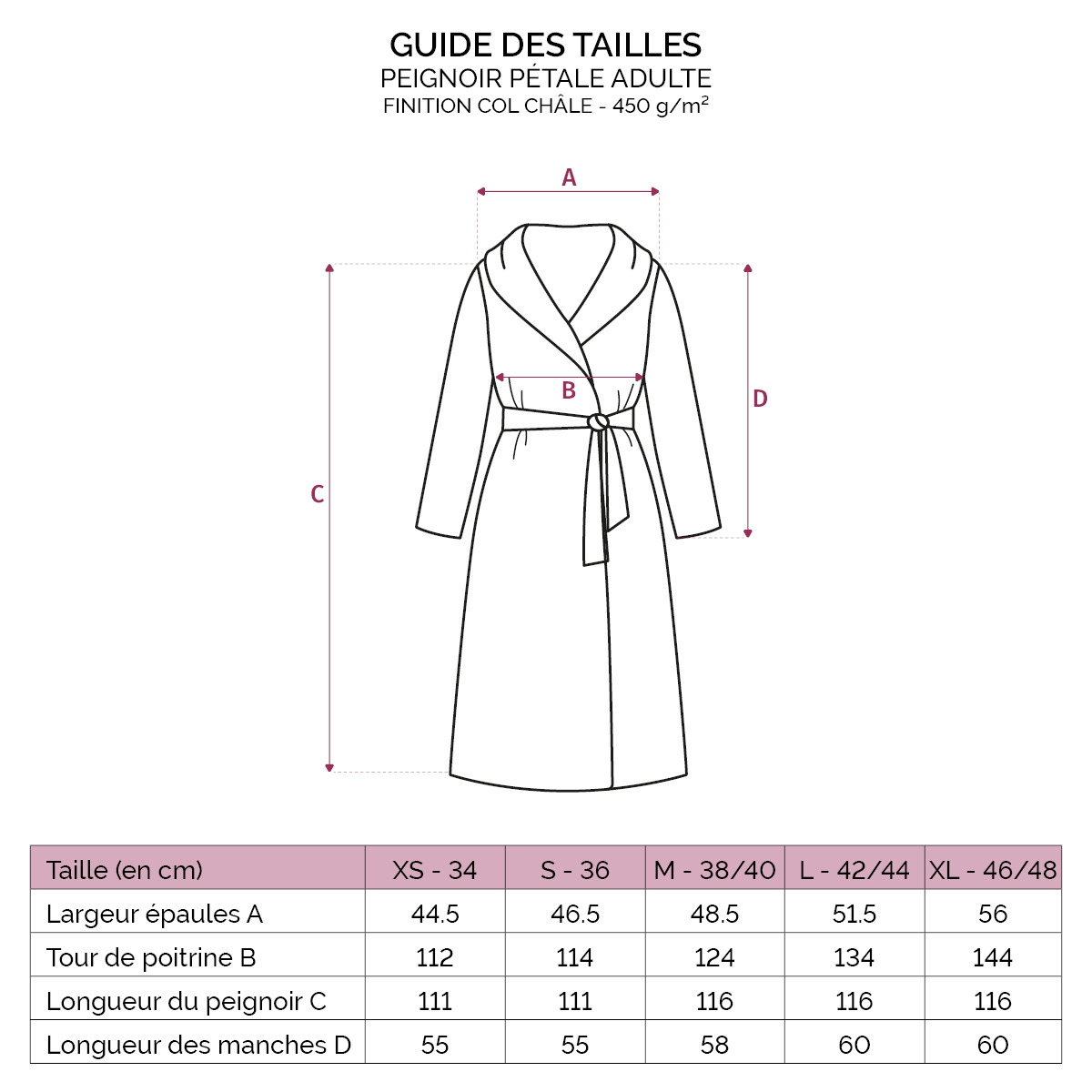 Décliné en une dizaine de coloris alliant subtilité et chatoyance dans un motif uni, du raffiné violet iris au délicat rose magnolia en passant par le dynamique bleu jacinthe ou le tendre vert nénuphar, le modèle de peignoir Pétale, présenté ici dans la teinte crème chèvrefeuille, est disponible en quatre tailles (XS, S, M et L) afin de flatter toutes les morphologies.