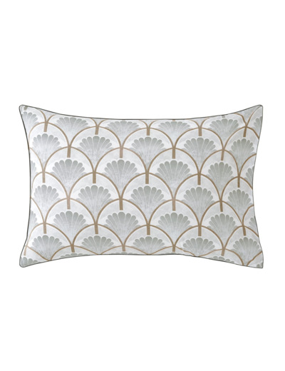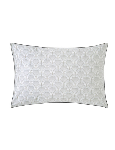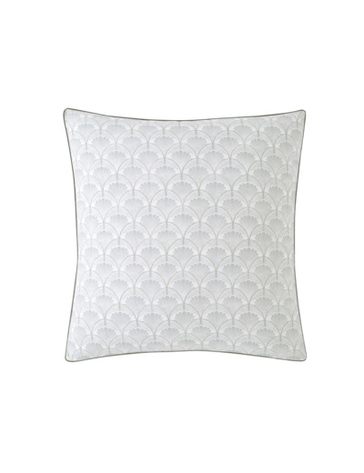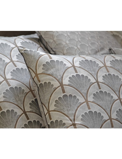 La face avant de cette taie, avec ses palmettes écailles à la fois féminines et masculines, développe un motif majestueux, la face arrière les revisite tout en nuances poudrées et discrètes.