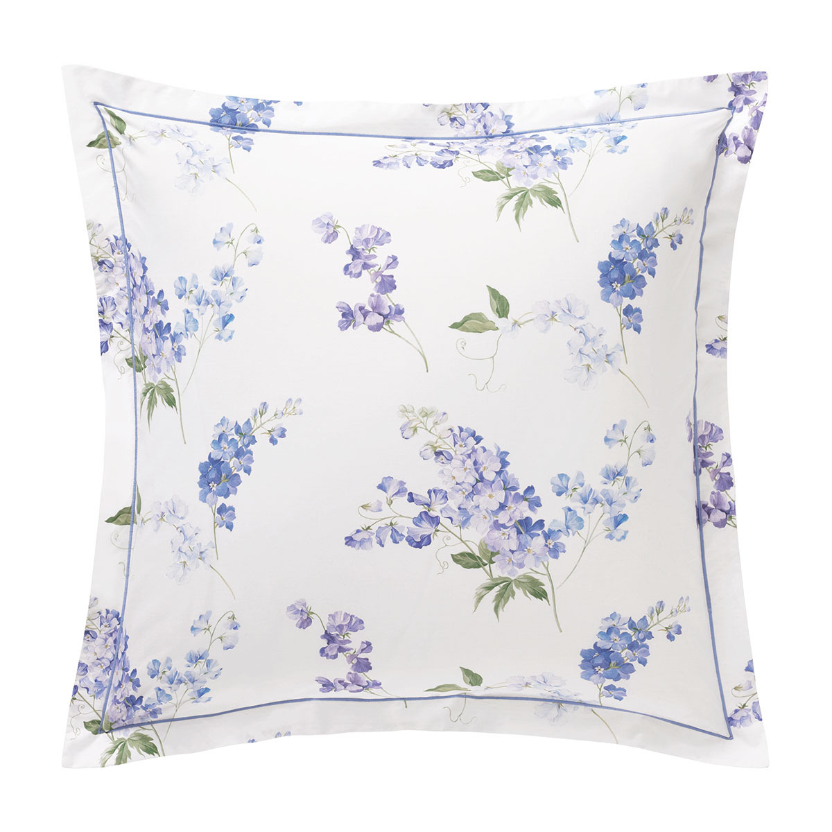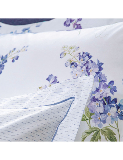 La taie est déclinée en 2 tailles 65 x 65 et 50 x 75 cm. La finition bourdon bleu lavande parachève élégamment le volant de 4cm.