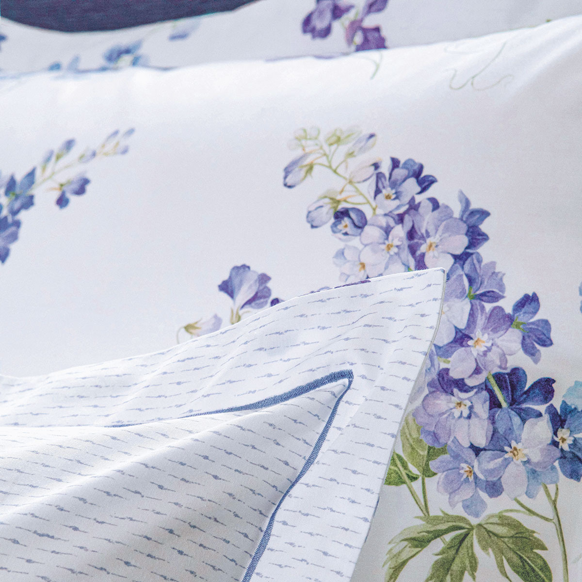 Imprimé sur percale 80 fils/cm² en coton issu de l’agriculture biologique, le motif de pois de senteurs et Veronica sur leurs tiges élancées se marie à une discrète répétition de traits irréguliers et diffus. L’ensemble insuffle une atmosphère des jardins romantiques.