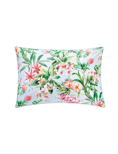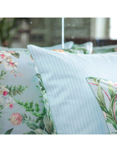 Imprimée sur satin 120 fils/cm² en coton issu de l’agriculture biologique cette taie sac offre un imprimé d’orchidées, d’hibiscus et clématites, réversible sur une douce rayure.