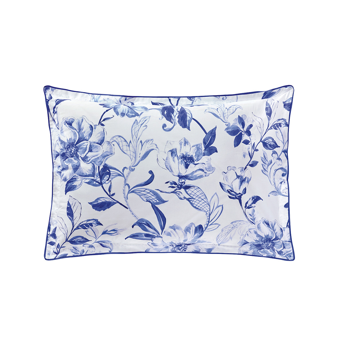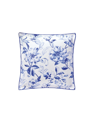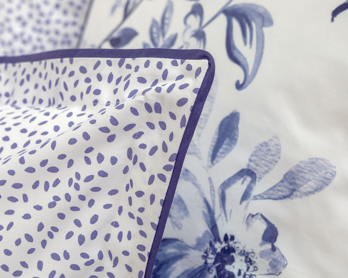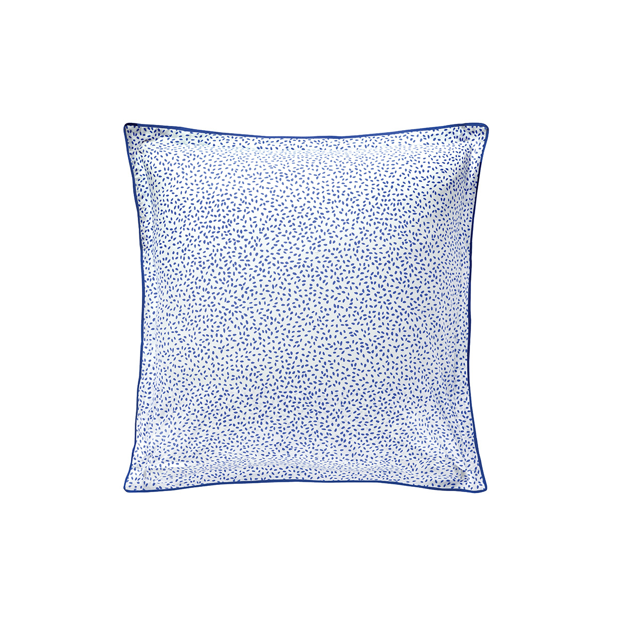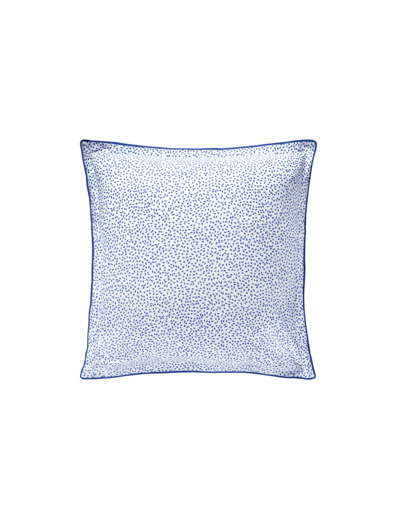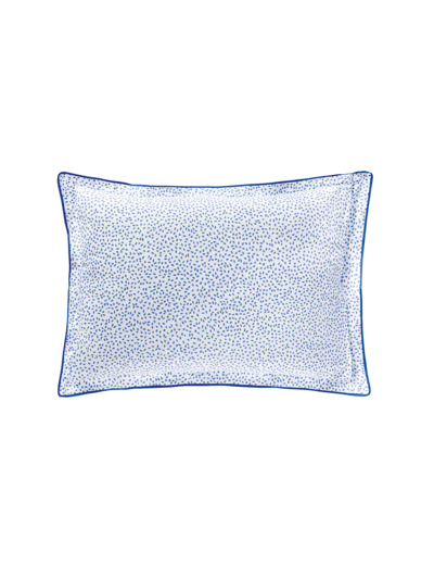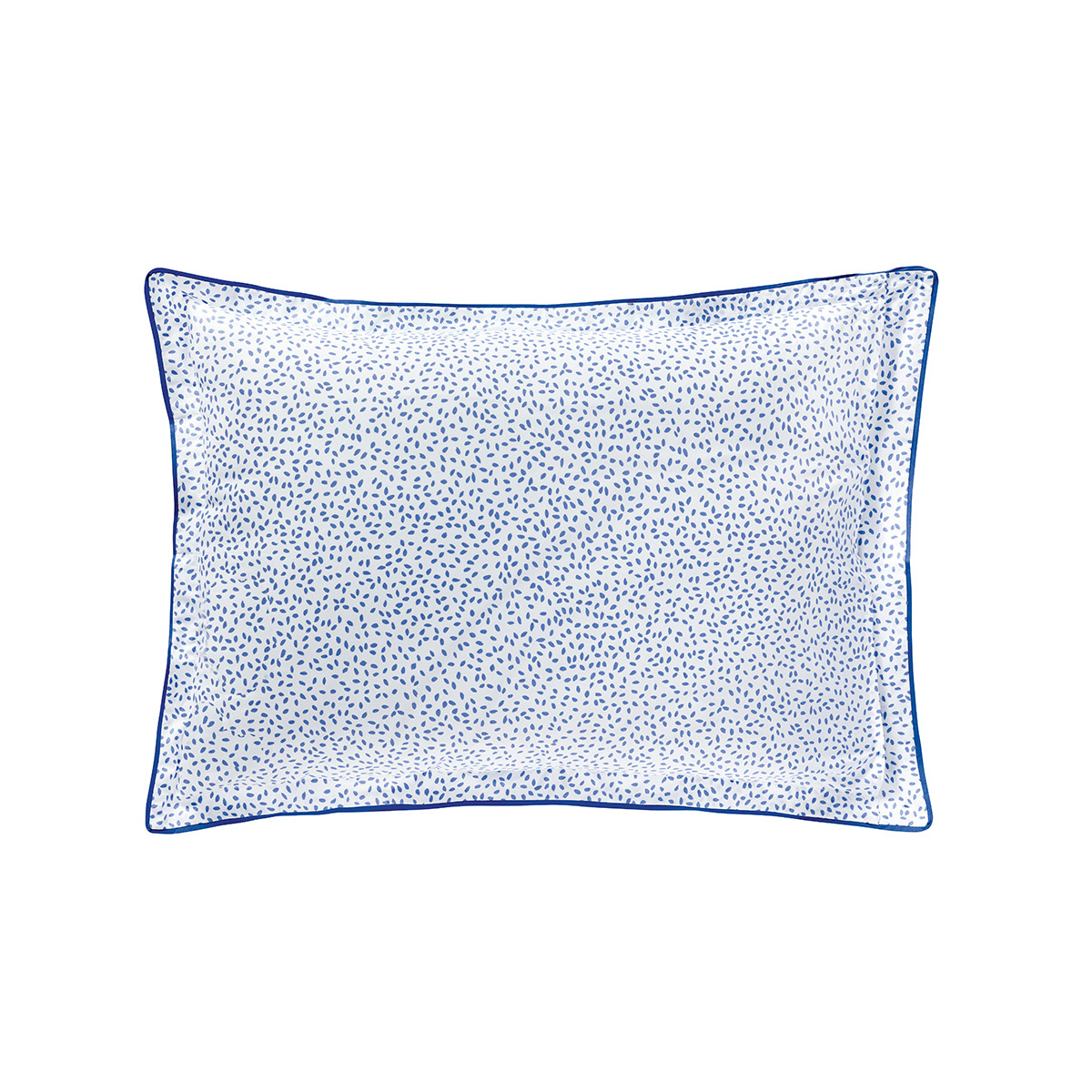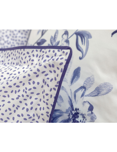 La taie est dotée d’un volant plat 3,5 cm avec une finition biais bleu et un simple rabat.