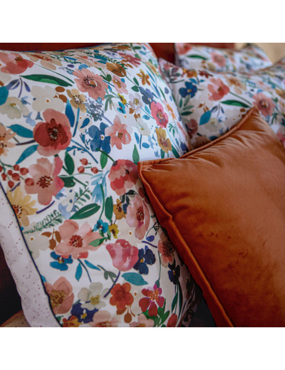 Cette taie d’oreiller a l’avantage d’être totalement réversible avec son passepoil velours bleu et son double rabat.