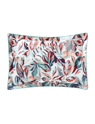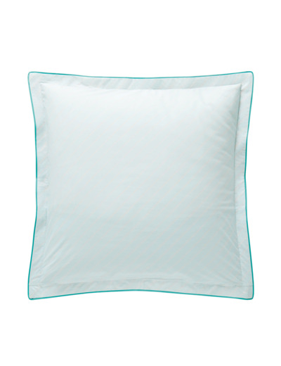 Résolument actuelle, la taie est confectionnée sur une percale de coton 80 fils/cm² et mixe une face végétale à une face habillée de rayures diagonales délicates, le tout paré d’un volant plat de 3,5 cm et d’un biais coloris vert. Elle est disponible dans deux tailles : 50 x 75 et 65 x 65 cm.