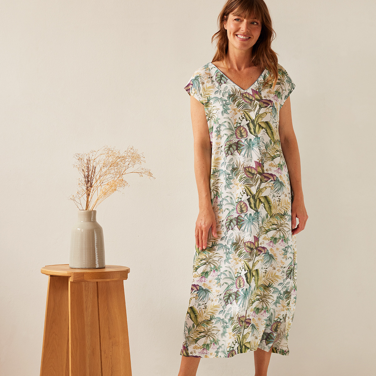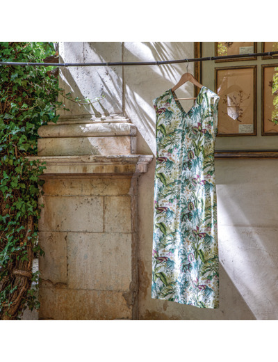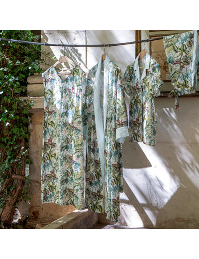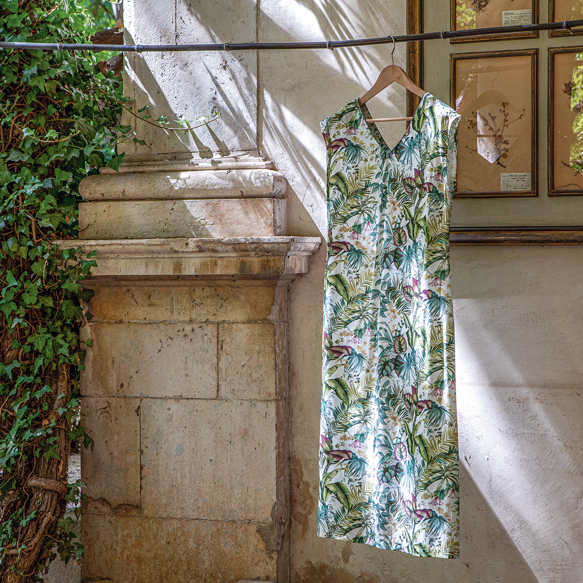 Conçue en viscose légère de 130 gr, cette liquette arbore un motif végétal exotique, créant une ambiance fraîche et délicate pour les nuits printanières et estivales.