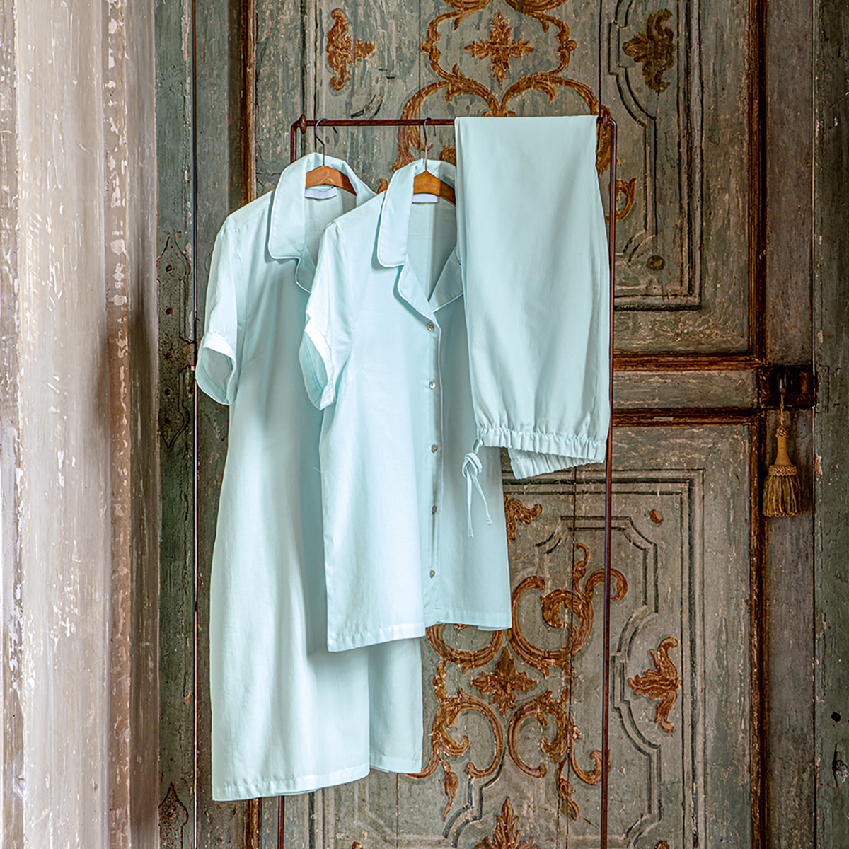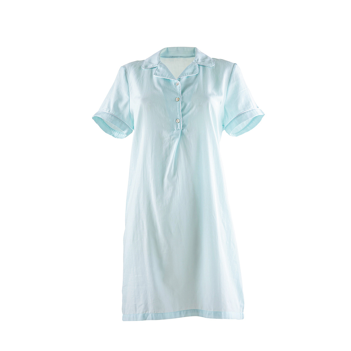 La chemise de nuit, élégante et fluide, enveloppe la silhouette avec délicatesse pour des nuits empreintes de douceur. La finition passepoil blanc ajoute une note de distinction, soulignant les lignes épurées de chaque pièce.