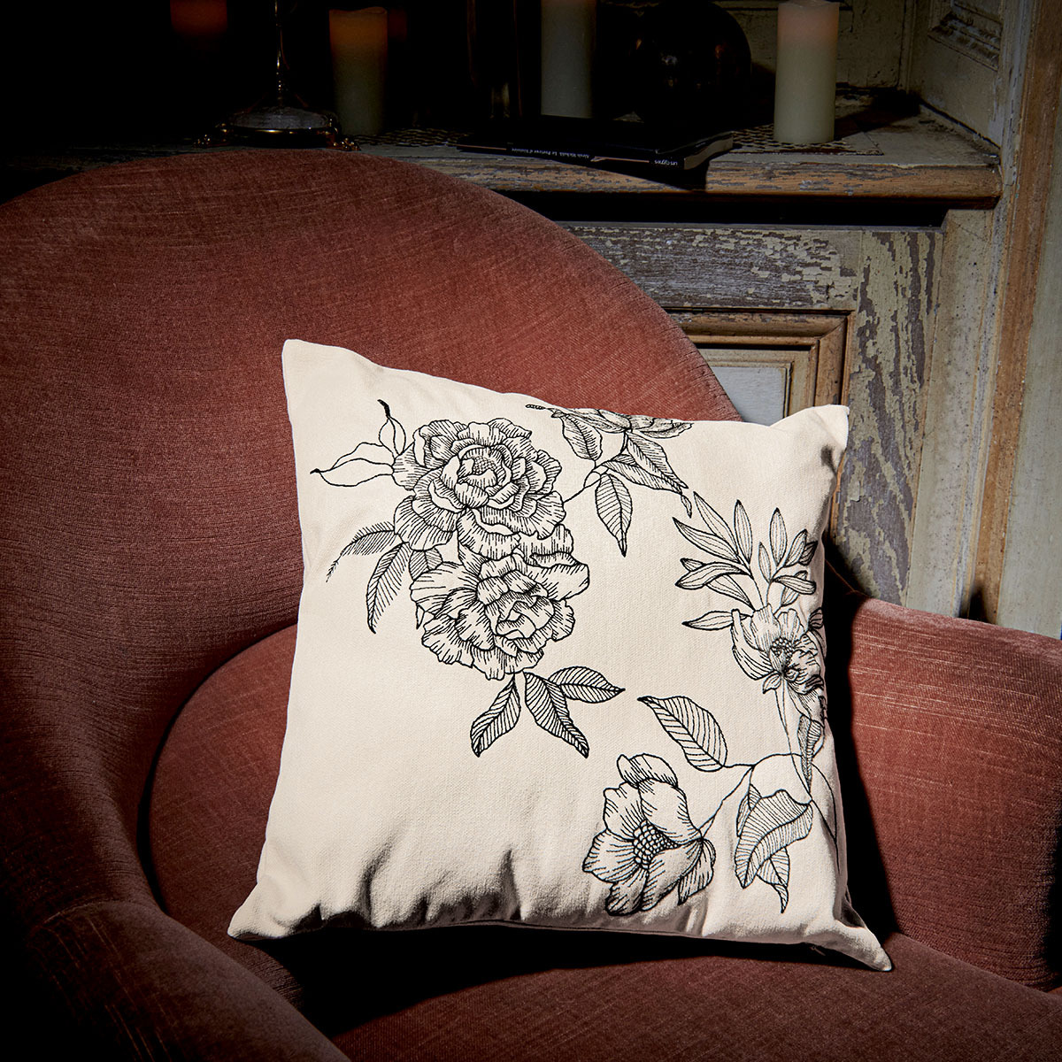 Séduction et élégance du coussin Ambre Nuit, une jolie interprétation de magnolias et de pivoines brodées sur un coton recyclé.