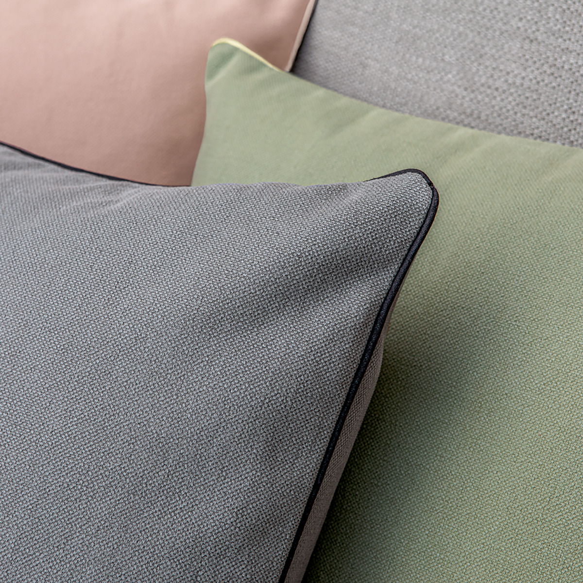 Apportez une nuance moderne avec le coussin AQUARELLE en coton recyclé couleur pierre. La finition passepoil anthracite ajoute une touche de sophistication.