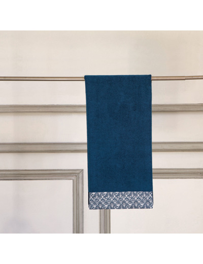Son design élégant en bleu navy uni avec un liteau en percale agrémenté d'un motif art déco, vous transporte dans l’univers du musée de la Toile de Jouy.