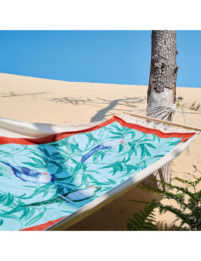 Des perroquets flamboyants échangent leurs secrets sur des branches de bambou, en animant ce drap de plage d’un charme tropical et vibrant.