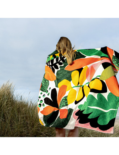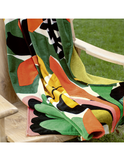 L’univers tropical caractérise ce drap de plage en velours multicolore dans un imprimé brésilien, aux couleurs luxuriantes vert menthe, mangue et papaye.
