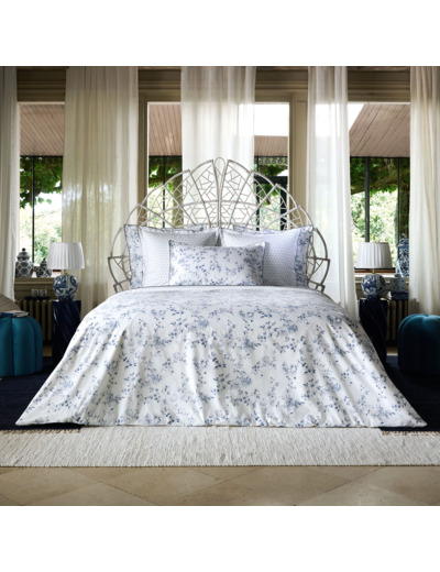 Un fond d’une blancheur éclatante, parsemé de subtils dégradés de bleu cobalt, insuffle douceur et classicisme à votre lit.