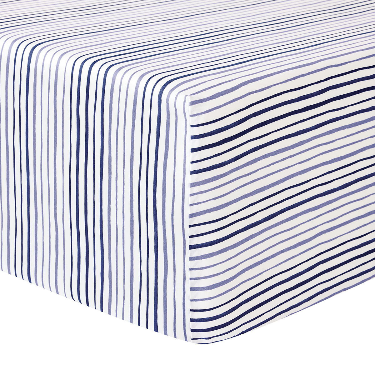 L’impression rayée en aquarellée de bleu se sublime sur la percale de coton 80 fils/cm², qui offre à la fois douceur et confort.