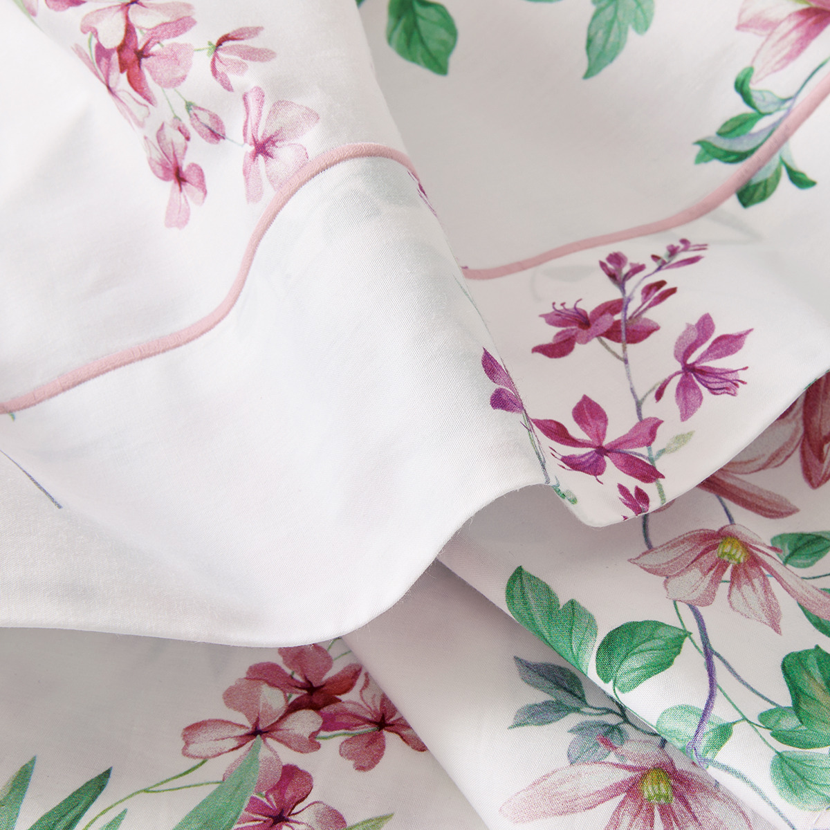 Les fleurs aériennes de gauras et de clématites semblent danser au gré du vent sur un fond de percale blanche, créant une atmosphère de poésie mythique dans votre chambre à coucher.