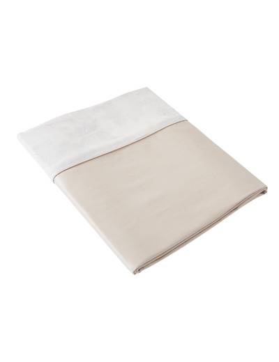 Le drap plat est dans un satin 100% coton, uni grège. Le damassé floral aux courbes douces présent sur le parement insuffle une lumière sophistiquée de tonalité seigle et blanc cassé, pour une chambre élégante et soyeuse, une simple piqure définit le parement du drap plat.