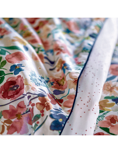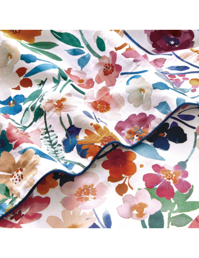 Ce drap plat est imprimé sur une percale 80 fils/cm², 100% coton. Un passepoil velours bleu surligne l’ourlet de tête.