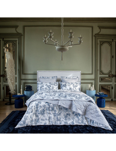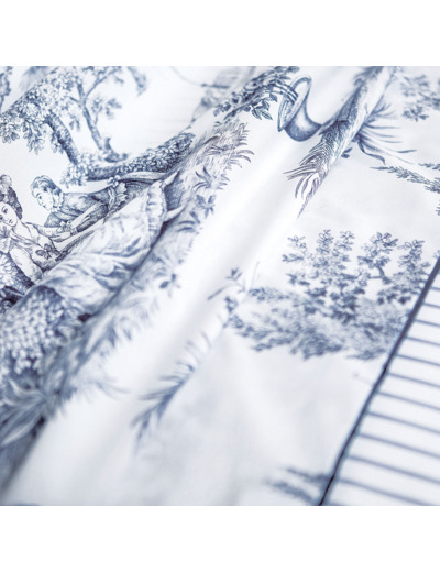 Le drap plat propose une impression de motif de toile de Jouy sur de la percale 80 fils/cm² 100% coton biologique.