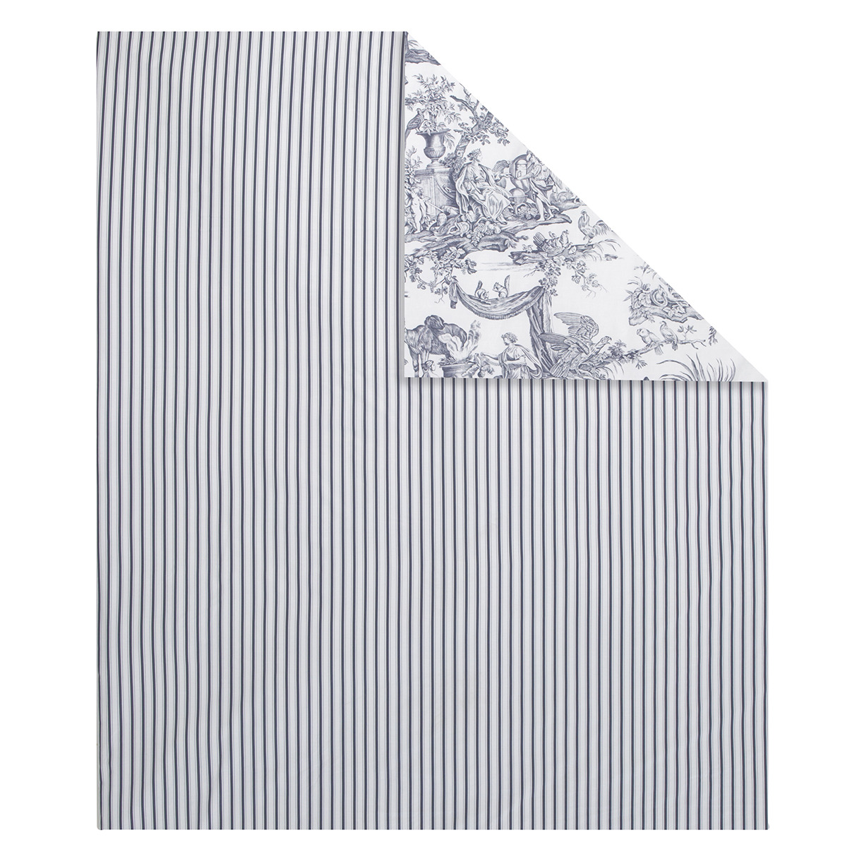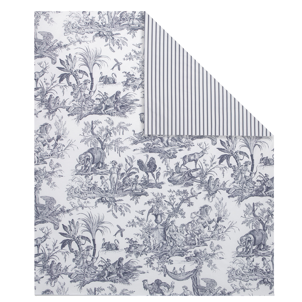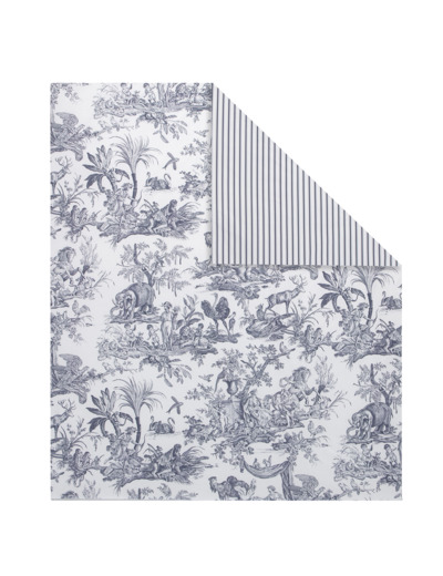 Réversible, on retrouve au recto un imprimé Toile de jouy qui représente les différents continents. Le verso se pare quant à lui de rayures verticales.