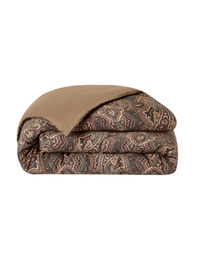 De majestueuses palmettes ocres composent l’imprimé cachemire sur un fond vert anglais. Le revers de la housse de couette s’anime d’un discret motif cravate au charme élégant.