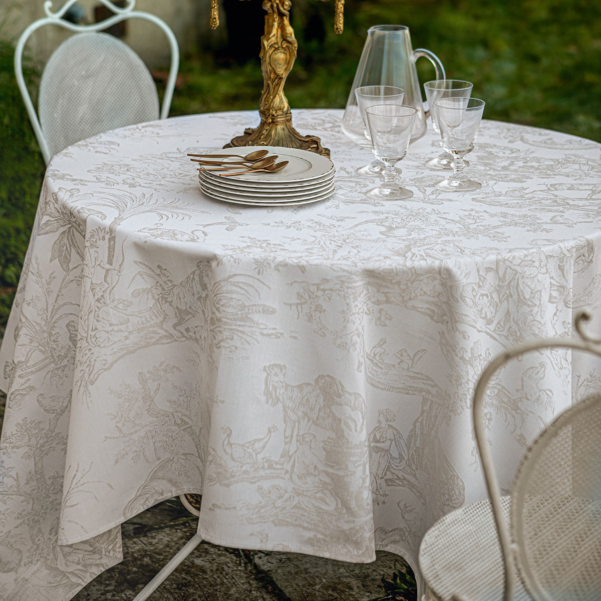 Cette somptueuse nappe en jacquard 100% coton rend hommage aux quatre continents de l'ancien temps, avec des motifs élégants et raffinés qui capturent l'essence de chaque région.