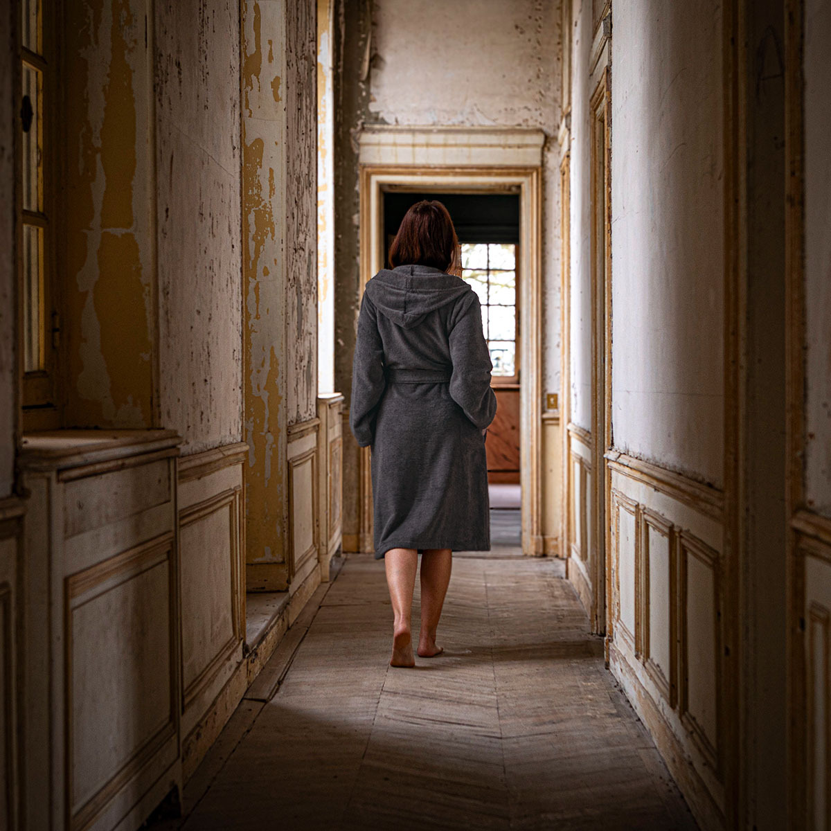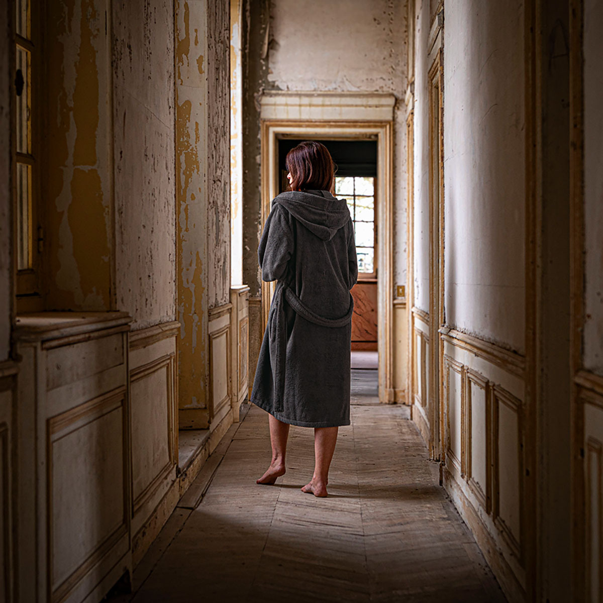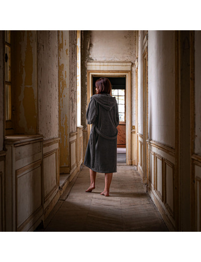 Explorez une élégance moderne et sophistiquée avec le peignoir à capuche Pétale, présenté dans le coloris poivre.