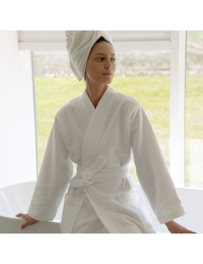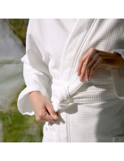 Craquez pour l’élégance de ce peignoir de bain en forme kimono, à la fois moderne et intemporel. En structure alvéolaire nid d'abeille , il bénéficie d'un intérieur bouclette 100 % coton peigné avec un grammage de 420g/m².