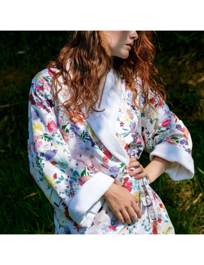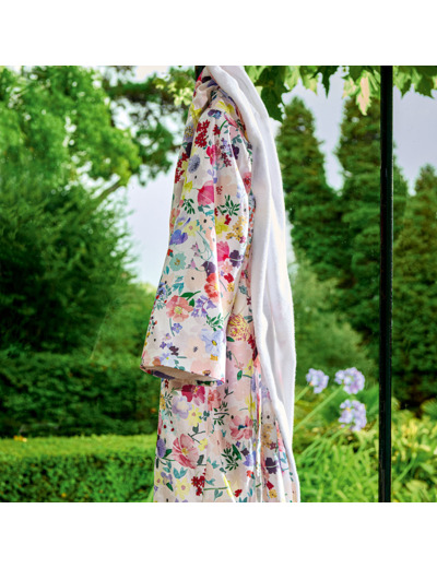Le grammage de ce peignoir est de 350 g/m², le rendant léger. Le tissu utilisé reprend le motif floral du modèle de linge de lit Paris Rio.