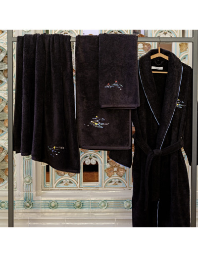 Son grammage de 450gr/m² vous offre une excellente absorption et permet de sécher rapidement. La broderie multicolore d’un couple de nageurs apporte une touche d’originalité sur cette éponge noire.