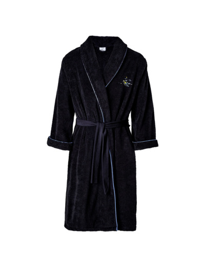 Ce peignoir en éponge bouclette 100% coton peigné avec un col châle gansé d’un joli passepoil bleu assure une parfaite mixité.