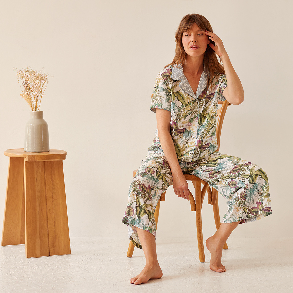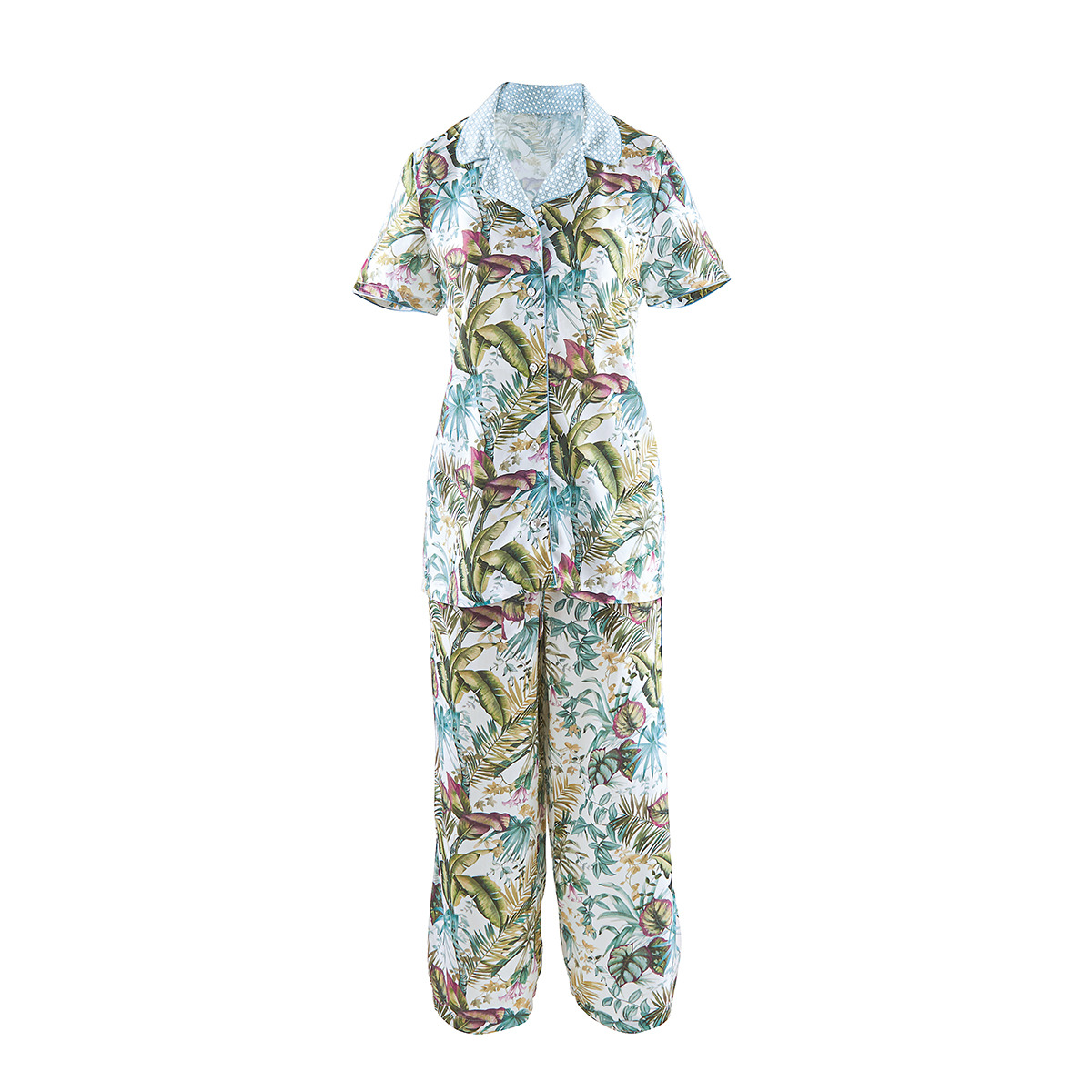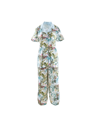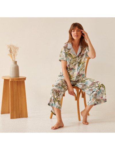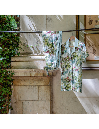 Réalisé en viscose légère de 130 gr, ce pyjama offre un motif végétal exotique, évoquant la fraîcheur des saisons estivales.