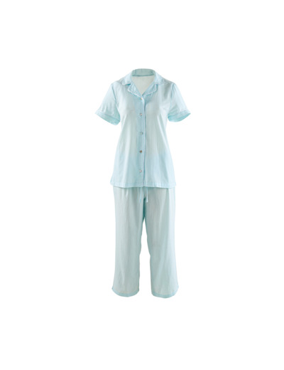 La finesse du tissu crée une sensation de douceur contre la peau, offrant un confort ultime pour la saison printemps/été. La chemisette à manches courtes du pyjama, associée à un pantalon 7/8e assorti, allie style et décontraction, créant un ensemble parfait pour les nuits douces. La finition passepoil blanc apporte une touche sophistiquée, soulignant les contours avec subtilité.