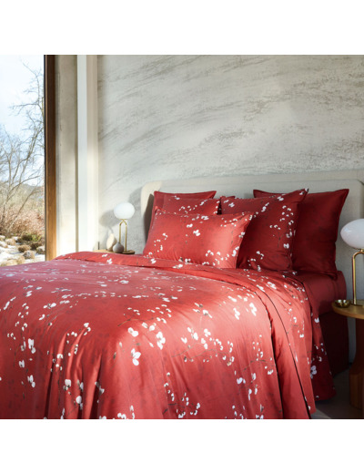 Jeu d’ombre floral stylisé, les silhouettes des fleurs de cerisier se détachent avec subtilité en camaïeux de rouges terres.