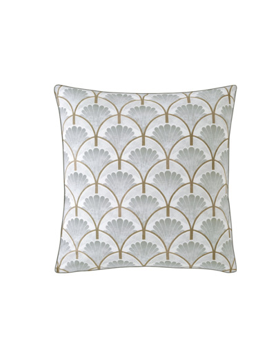 La face avant de cette taie, avec ses palmettes écailles à la fois féminines et masculines, développe un motif majestueux, la face arrière les revisite tout en nuances poudrées et discrètes.