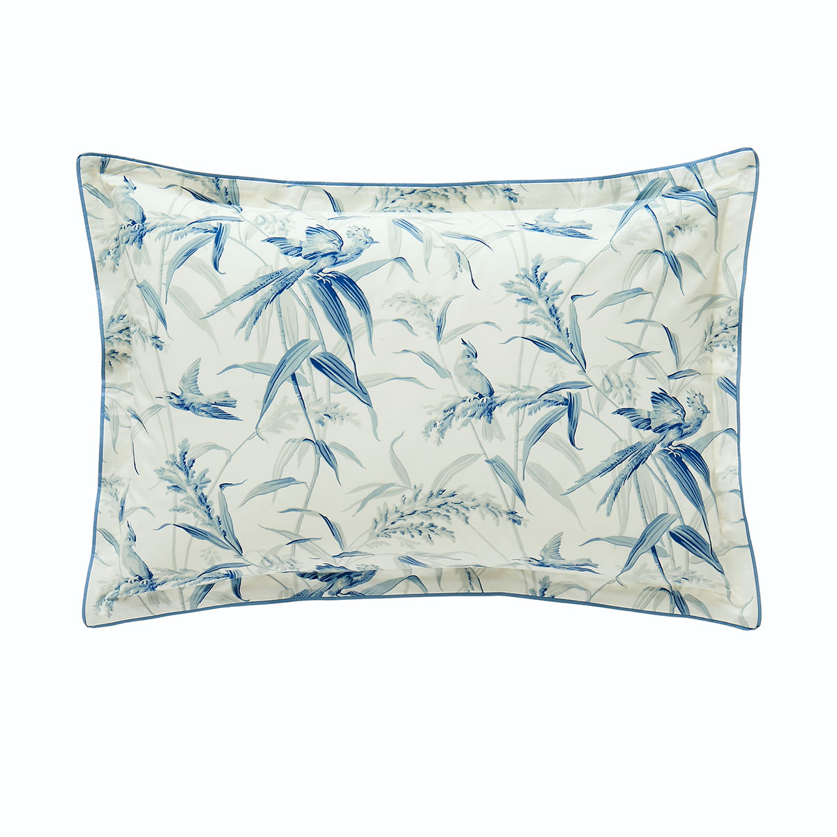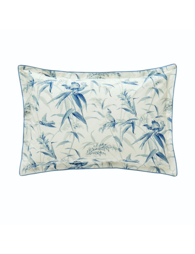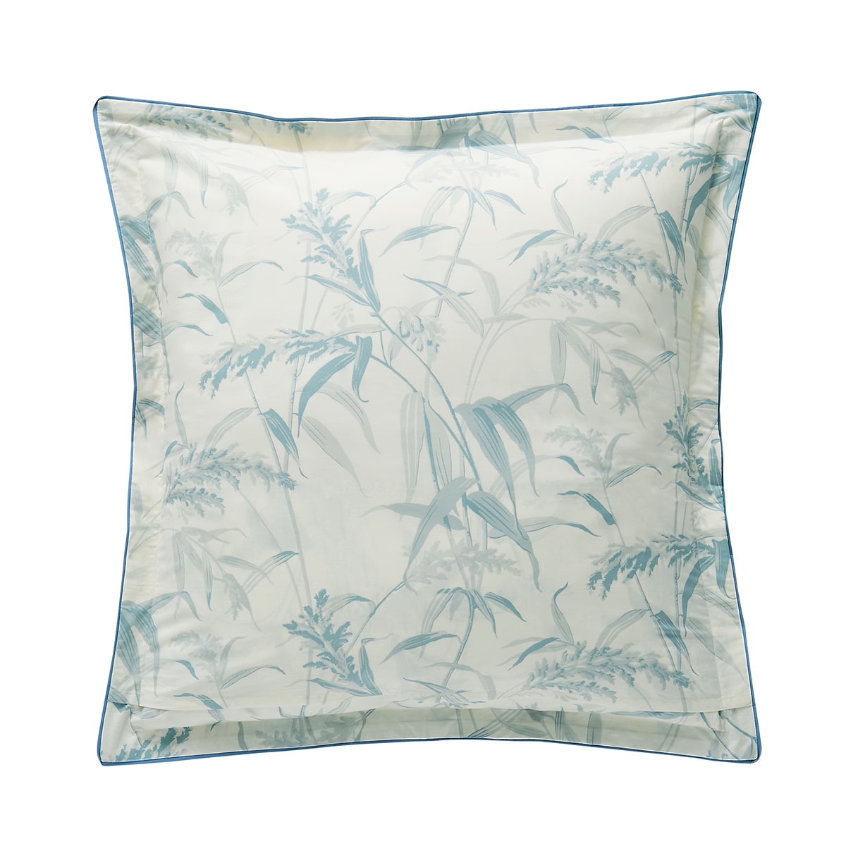 Les taies d’oreillers, rehaussées d’un volant plat de 3 cm et d’une finition biais bleu, apportent une touche de sophistication discrète.