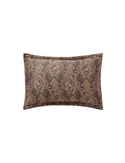 La taie offre un motif de palmettes aux tons ocres et vert anglais réversible sur un imprimé inspiré des pochettes de costumes masculins.