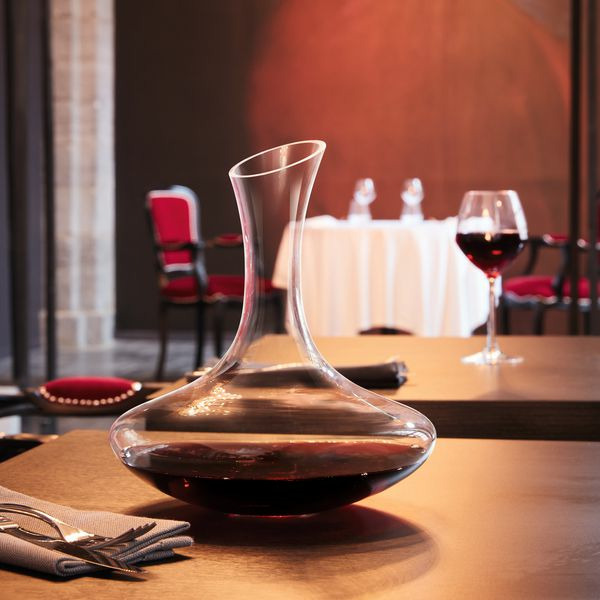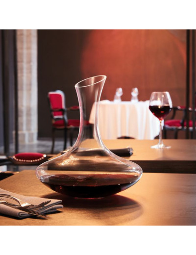 L’encolure, assez large, facilite le transvasement de la bouteille à la carafe. Les molécules du vin se bousculent dans le col en diabolo pour permettre une bonne oxygénation. Le vin glisse ensuite le long de la paraison intérieure et inférieure pour venir remplir la moitié du bulbe, maximisant ainsi le contact air-vin et permettant un épanouissement parfait du vin.