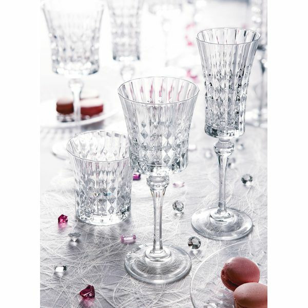 Avec sa multitude de facettes qui accroche la lumière, Lady Diamond est parfaite pour transformer vos petites occasions en instants festifs. À l'effet cristal taillé, son design est pur comme un diamant. La collection Lady Diamond permet de dresser une table raffinée. Fabriquée en cristallin, la brillance du matériau révèlera l'élégance de son design structuré. Cette collection comprend des verres à pied qui trouveront leurs places pour le service du vin blanc et rouge, la flûte pour les vins effervescents, les gobelets accueilleront vos cocktails ou de l'eau.