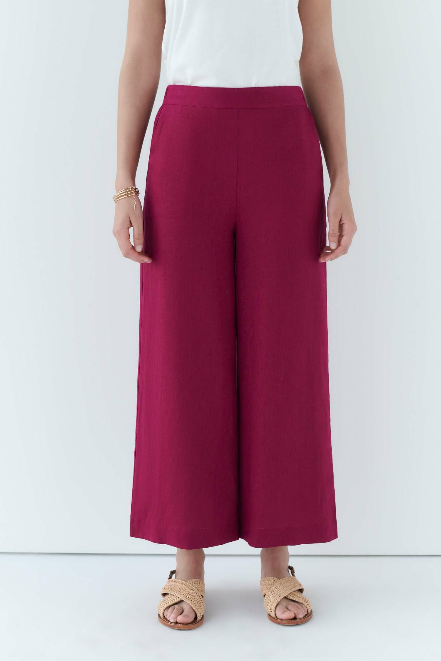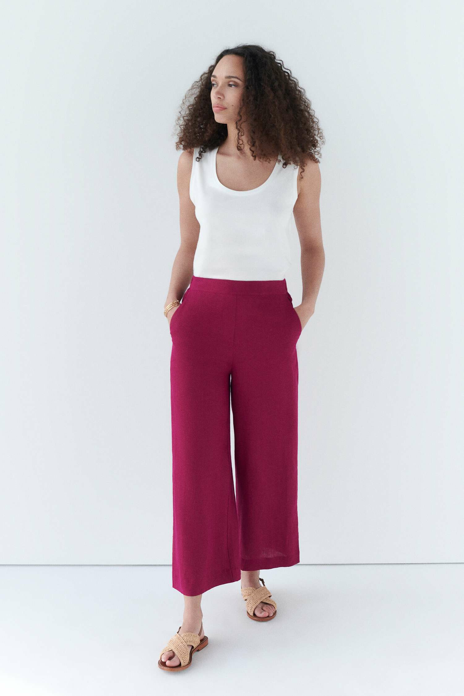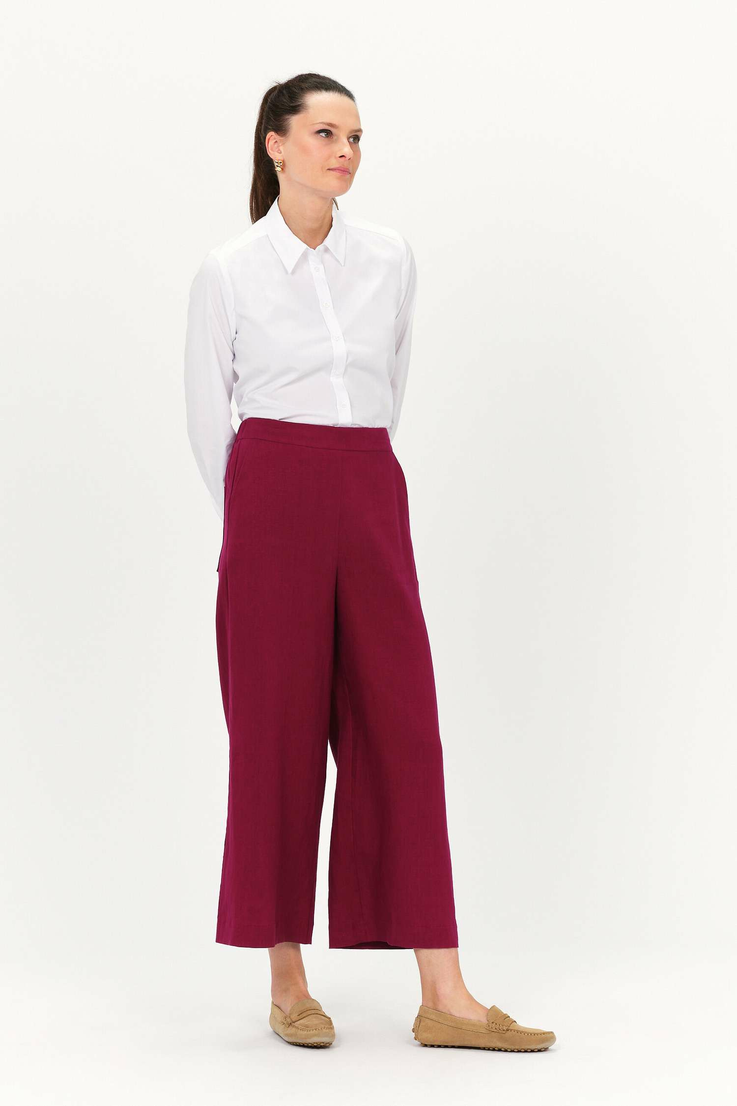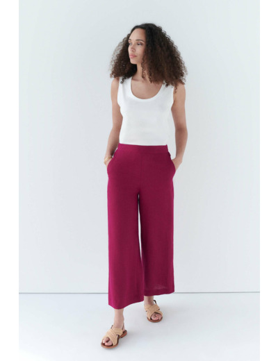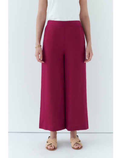Élégant et léger grâce à sa composition en lin, le pantalon ample pandi est de couleur unie. - Taille haute élastiquée au dos - Modèle 4 poches - Poches italiennes devant - Longueur totale, 95 cm pour une taille 38