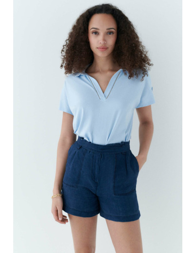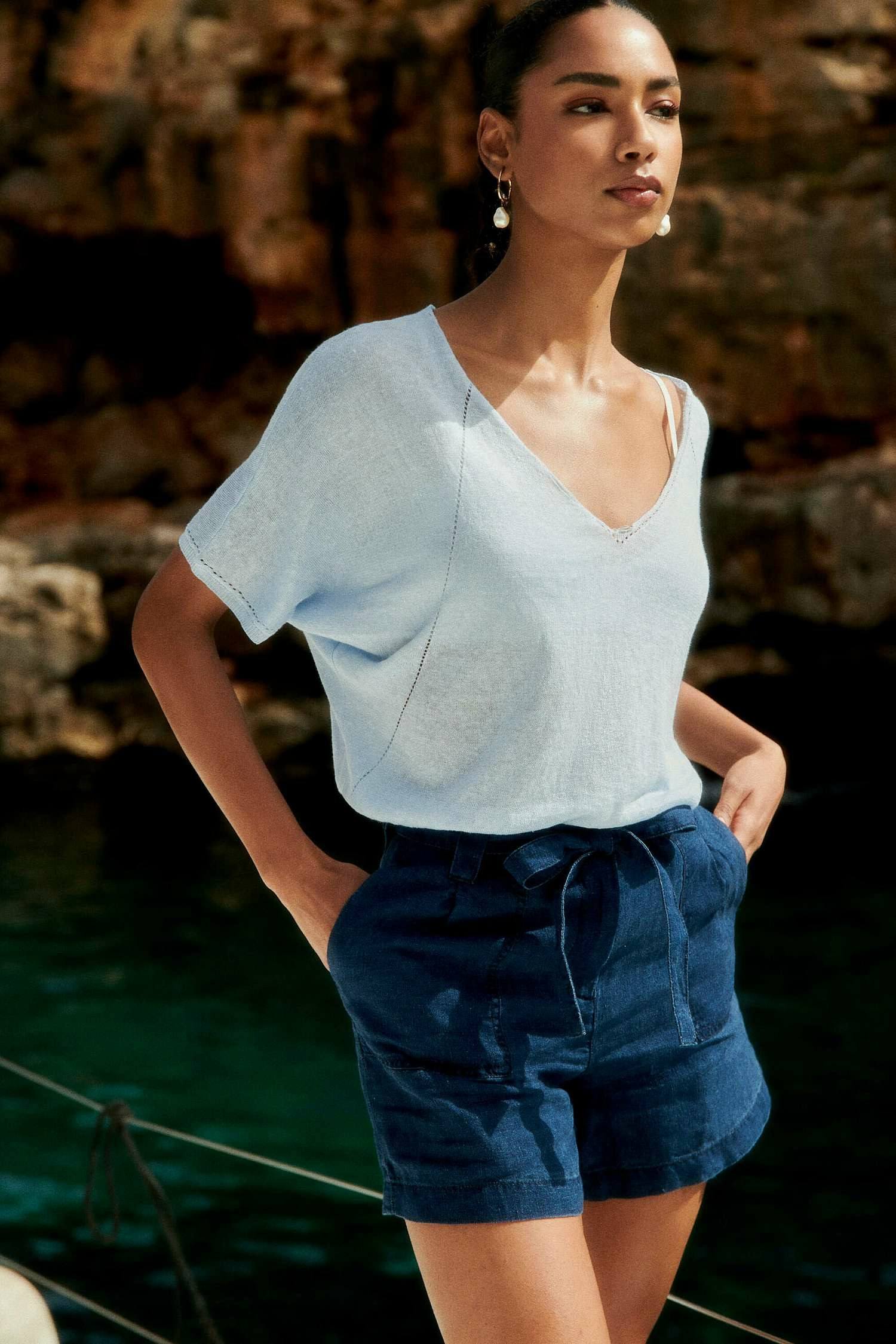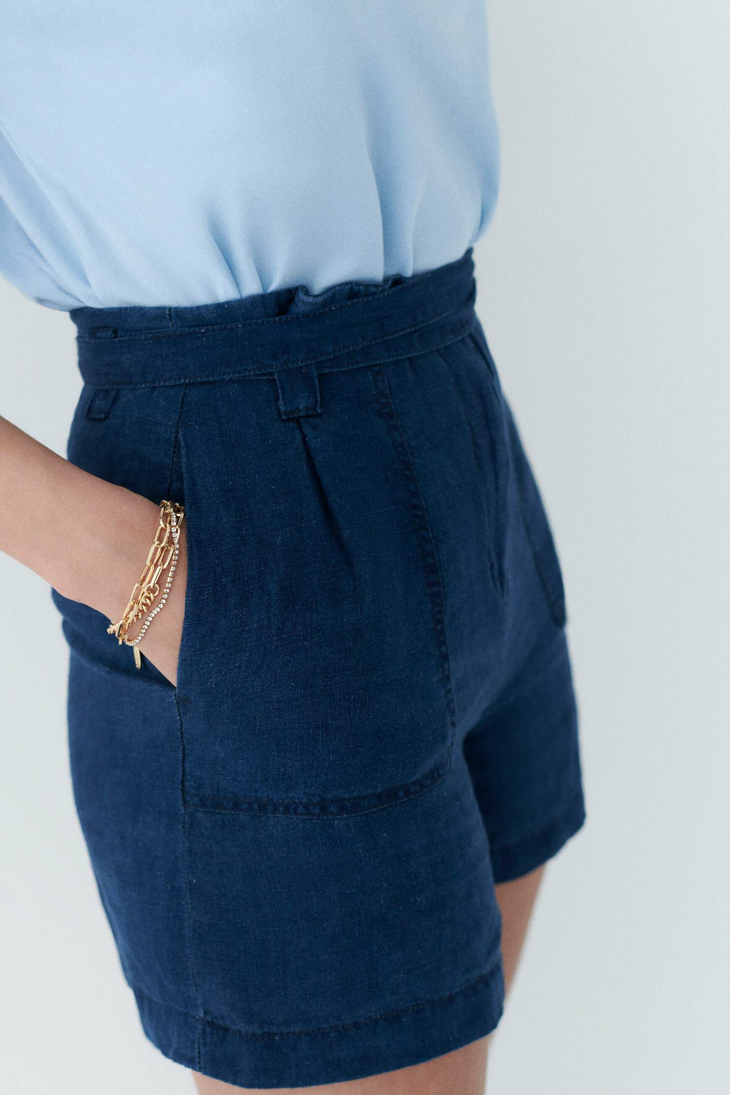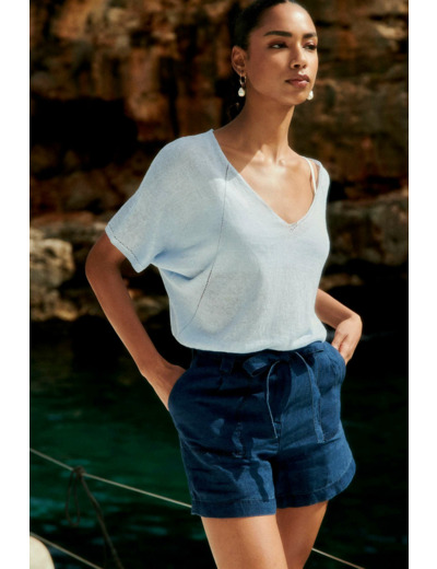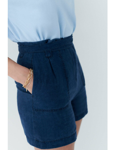 Short 100% lin, travaillé dans un coloris façon denim afin d'allier fraicheur et dégaine casual. Une coupe paper-bag très tendance, marquera votre silhouette pour une allure décontractée twistée d'une touche féminine. - Short taille haute à la coupe fluide - Fermeture par une agrafe et un zip sous-patte - Ceinture ton sur ton à nouer - Larges poches plaquées devant et poches revolver au dos - Longueur entrejambe 12 cm pour une taille 38