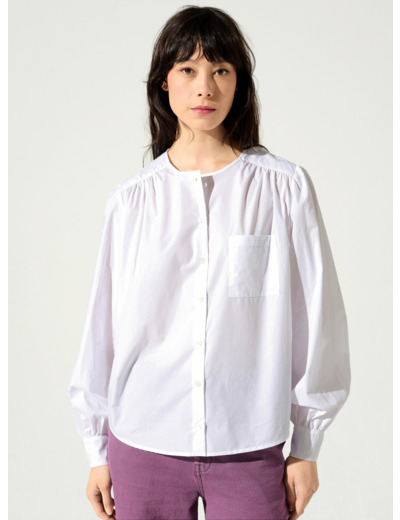 Blouse ample à manches longues blousantes, boutonnée sur le devant ainsi que sur les poignets. Vous aimerez sa poche plaquée à la poitrine ainsi que son empiècement de tissu matelassé aux épaules.