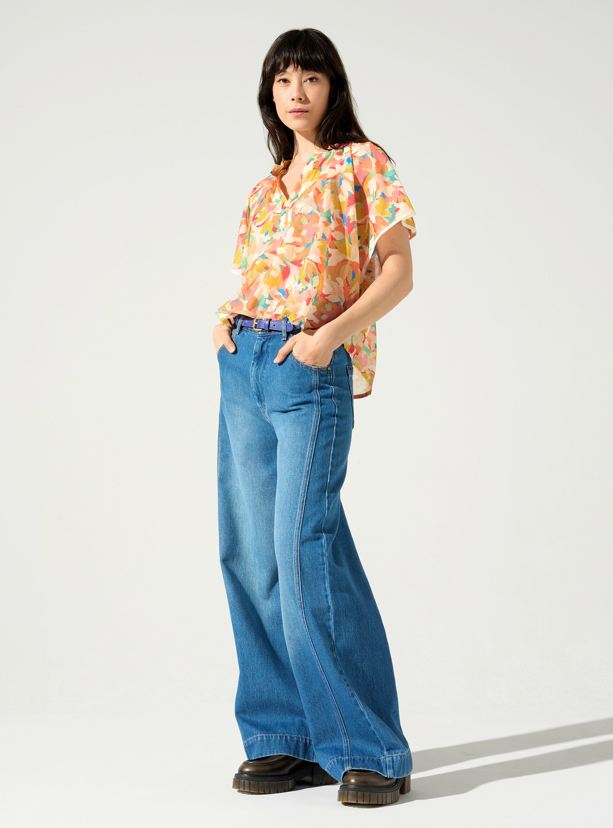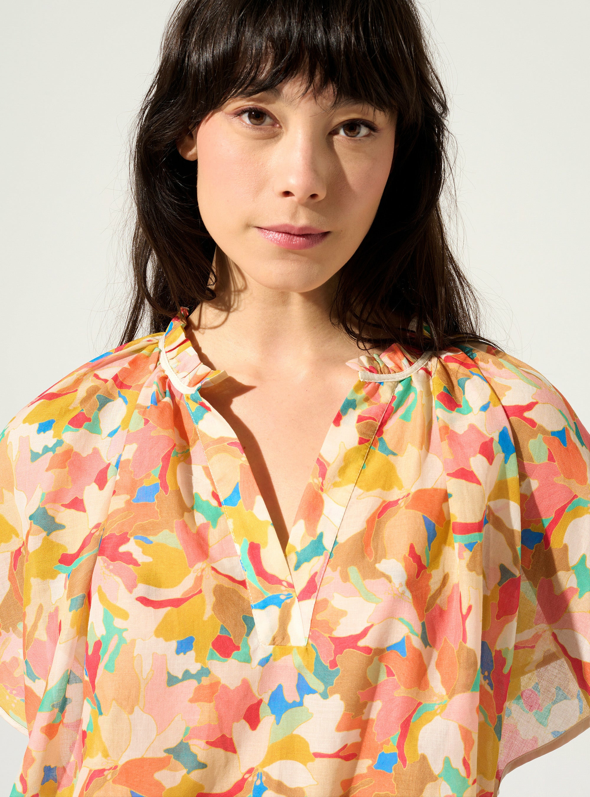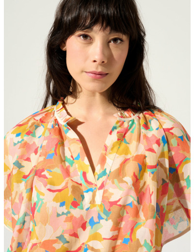 Blouse à la coupe oversized et aux manches courtes avec un col en V plongeant. Vous aimerez ses détails : les plis à l'encolure ainsi que le biais contrasté pour la finition bas de manche et à l'encolure. Pièce idéale pour les beaux jours grâce à l'imprimé exclusif « Bloom » décliné dans une variante lumineuse sur un voile de coton léger.