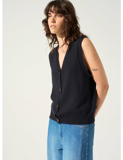 Gilet ajusté sans manches à l'encolure V fermée par boutonnage sur le devant.