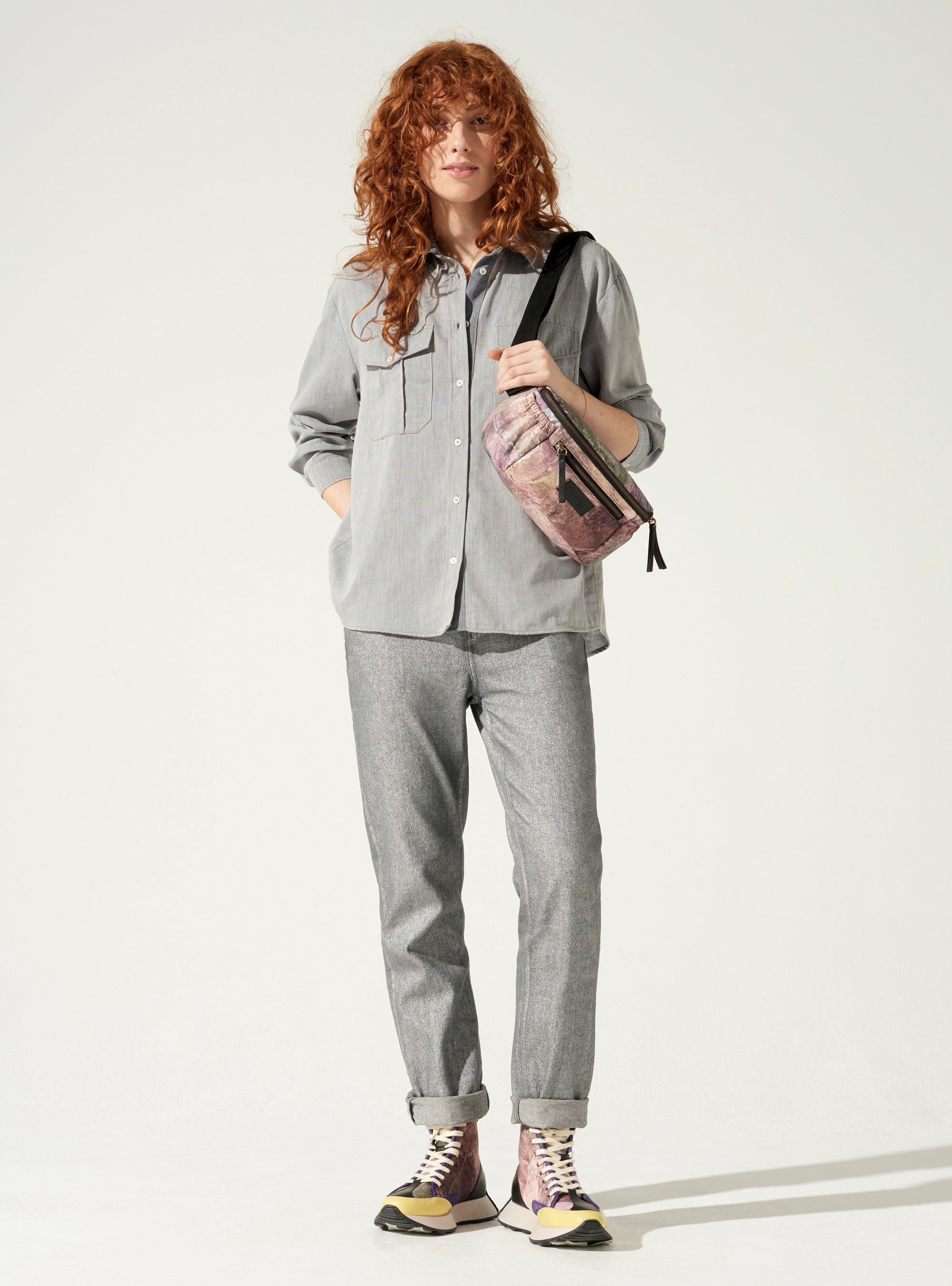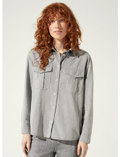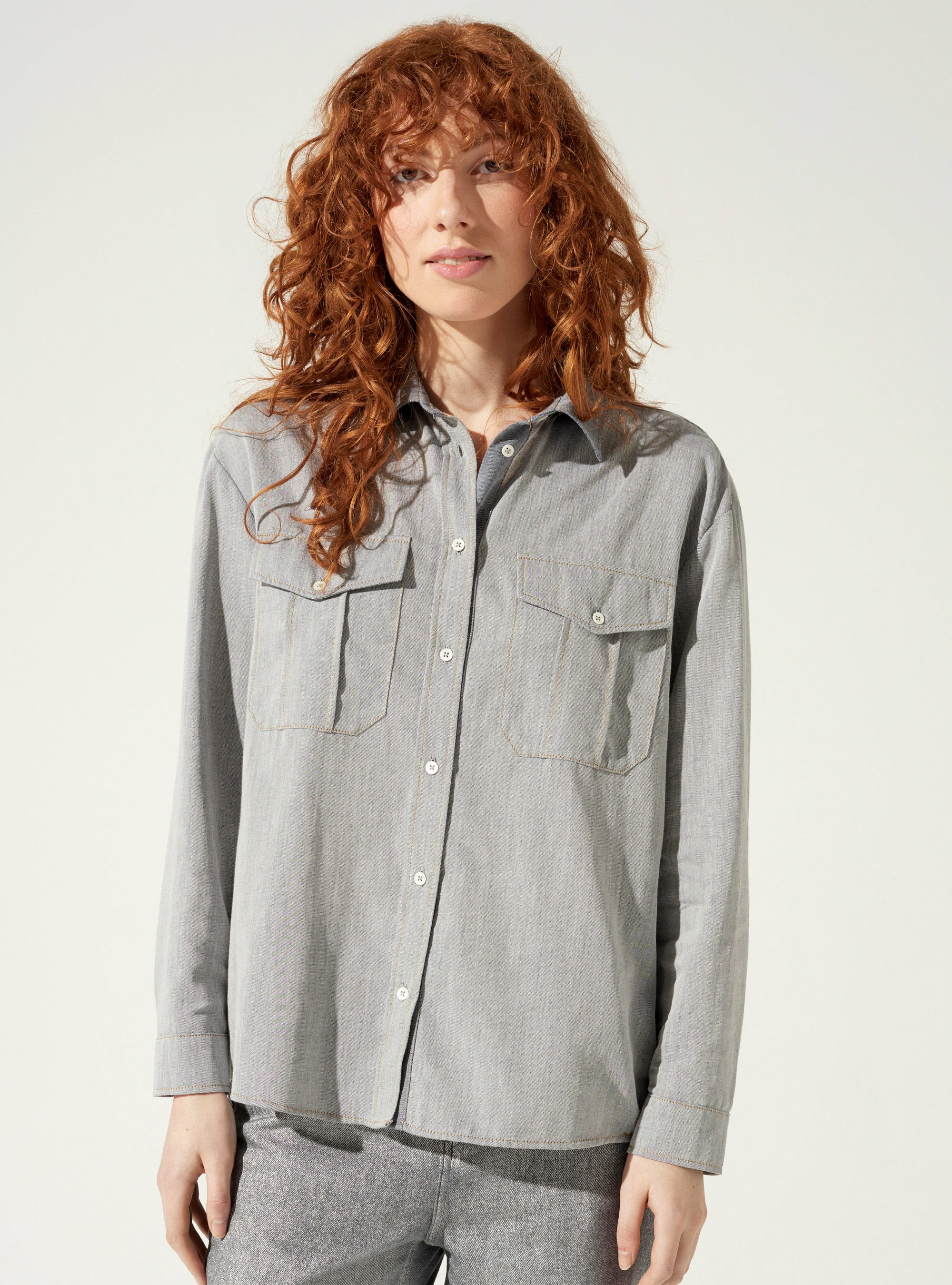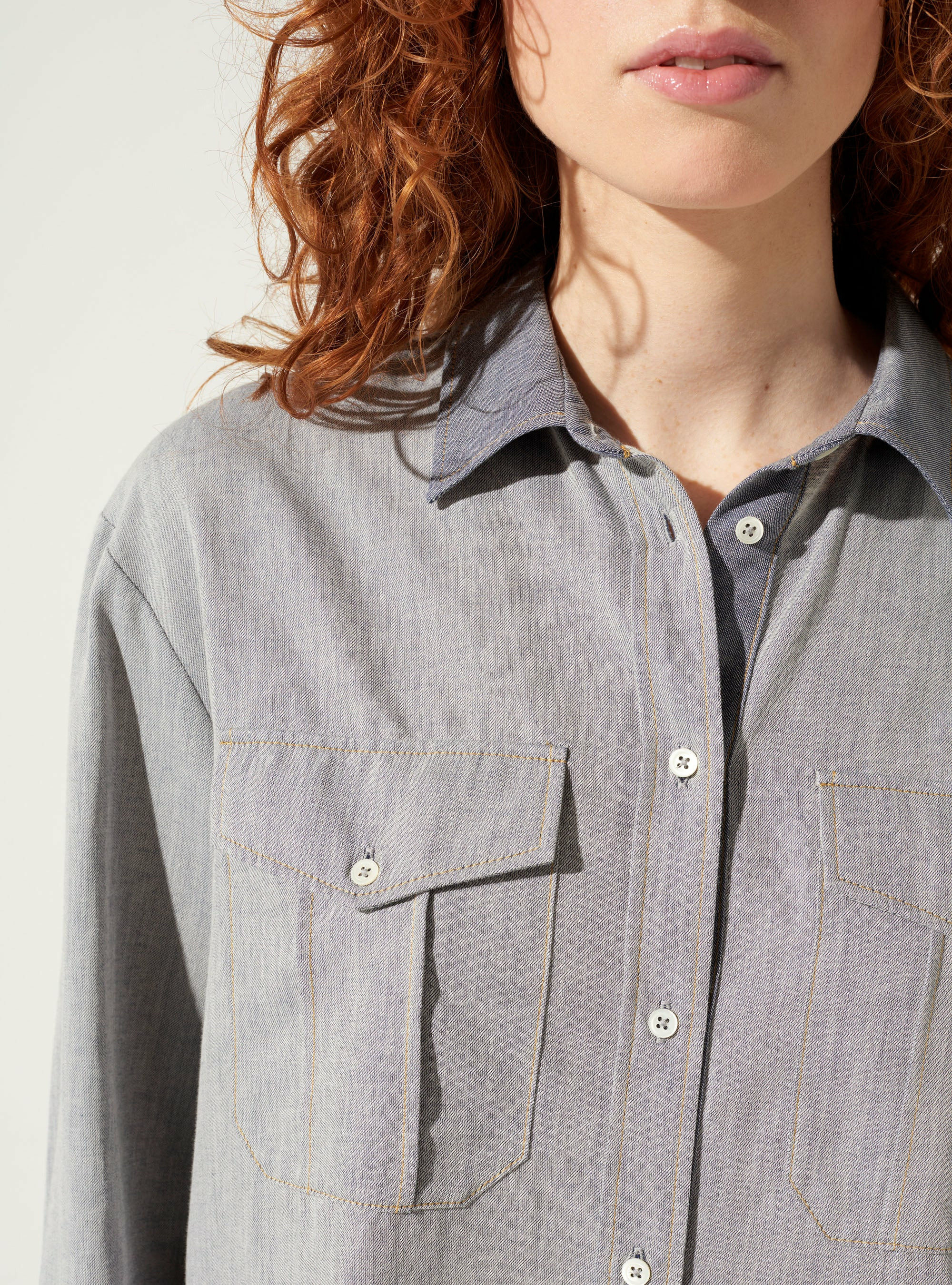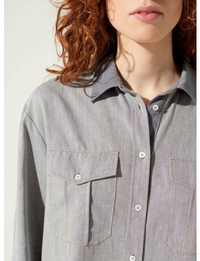 Chemise droite à manches longues boutonnées au niveau des poignets ainsi que sur les rabats des poches plaquées sur la poitrine. Vous aimerez son détail de tissu envers/endroit en contraste ainsi que le pli rond dans le dos. Matière 100% coton façon chambray : idéale pour les beaux jours avec sa toile légère et respirante.