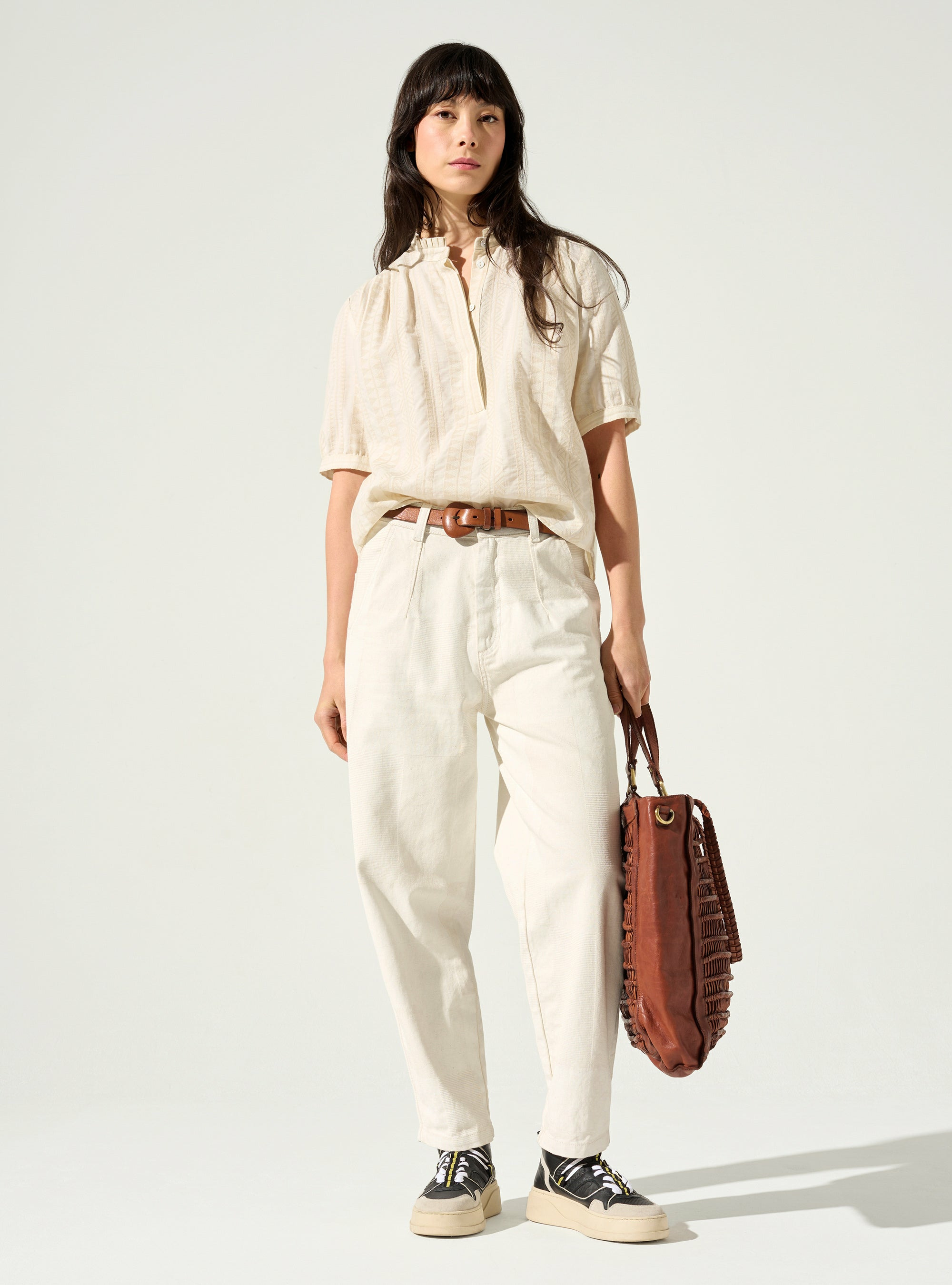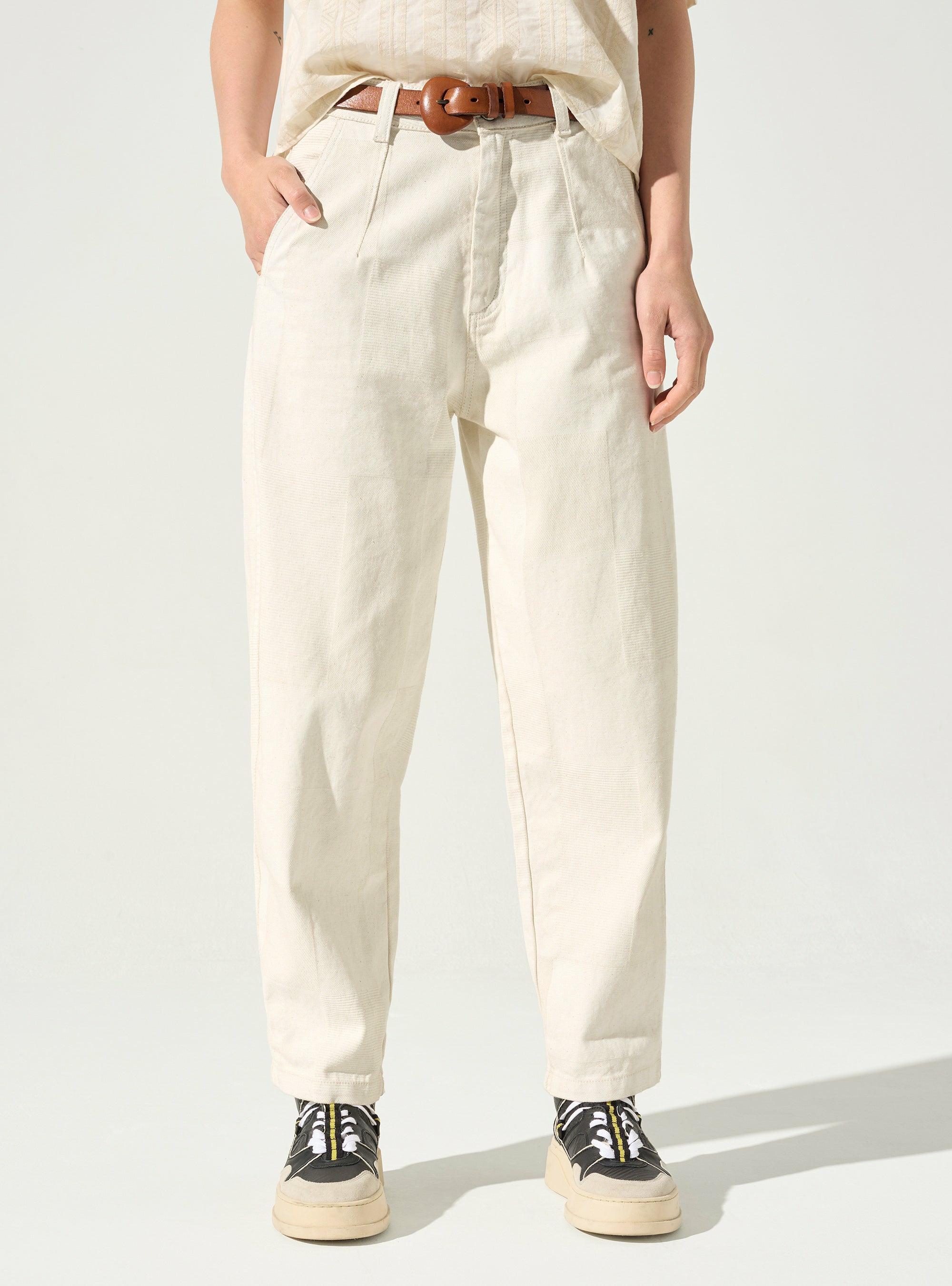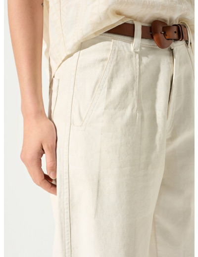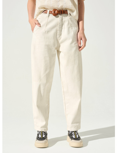 Pantalon longueur chevilles coupe baggy avec son volume large resserré sur le bas des jambes et ses poches plaquées au dos. Le détail en plus : le jacron en cuir au dos.